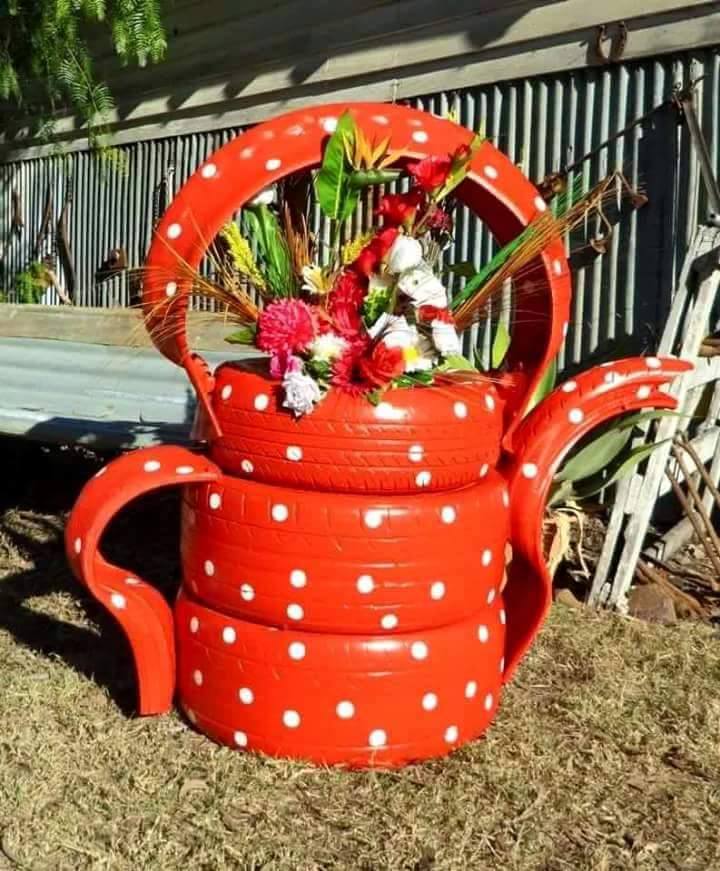 Если у вас есть набор шин, которые можно использовать в саду, вы можете использовать их для создания тематических кашпо, таких как эти кашпо из шин, которые выглядят как чашки и блюдца для чая или кофе.