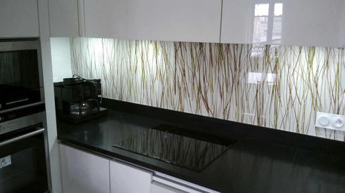 Стеклянный фартук представляет собой толстую стеклянную панель с обработанным краем, часто с рисунком.Панно может быть цельным – во всю стену, или сборной, состоящей из нескольких частей. Самостоятельно установить готовый фартук несложно. Для этого нужно приложить панель к стене и сделать в ней разметку для отверстий. После этого нужно просверлить отверстия и с помощью дрели или перфоратора вставить в них пластиковые дюбели. В дальнейшем панель надежно прикручивается шурупами, а их шляпки закрываются декоративными заглушками. Как происходит установка стеклянного фартука можно увидеть на видео.