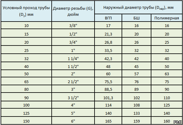 Размер трубы в таких случаях рассчитывается с учетом определенных особенностей, присущих таким изделиям. В частности, для стального проката, обозначенного как дюймовый, величина наружного диаметра оказывается равной 33,5 мм, а внутреннего — отличается в зависимости от того, имеем дело с обыкновенной трубой (27,1 мм) или усиленной (25,5 мм), что почти в точности соответствует одному дюйму. Эти характеристики стальных изделий следует обязательно учитывать, производя замену на аналоги, выполненные из других материалов. Работая с трубопроводами, следует опираться на величину условного прохода.