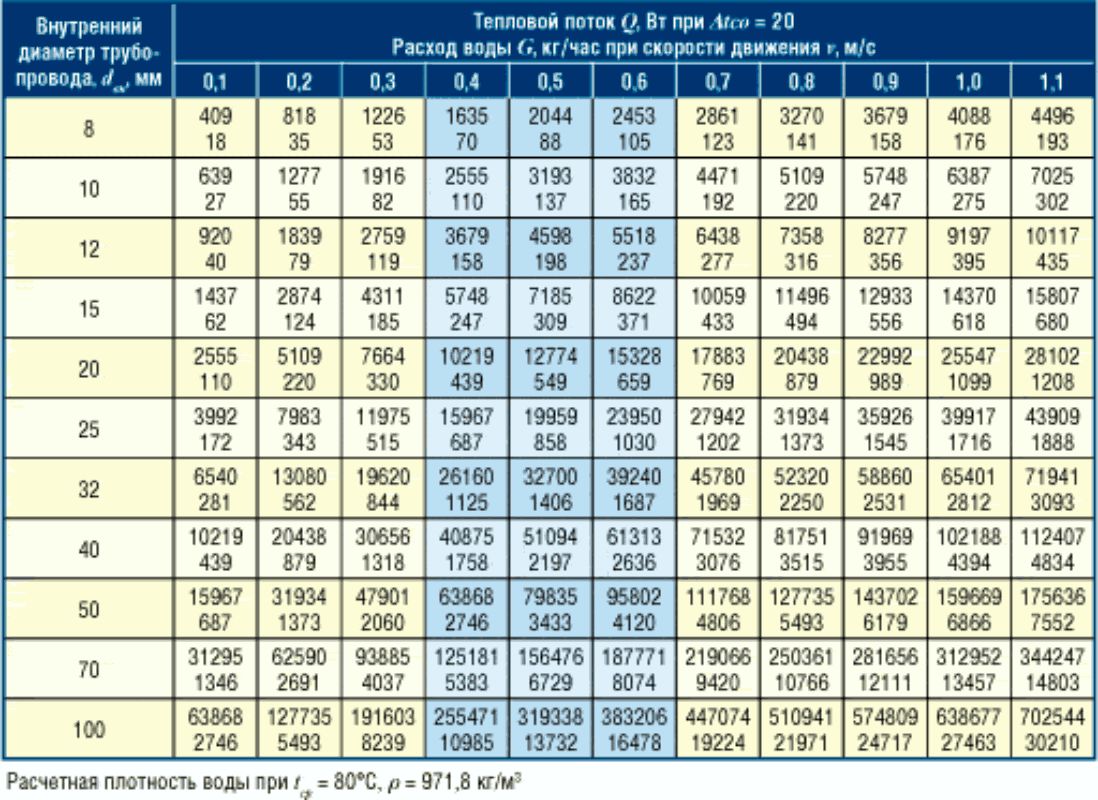 Зависимость между расходом (л/мин), скоростью потока (м/с) и диаметром трубы.