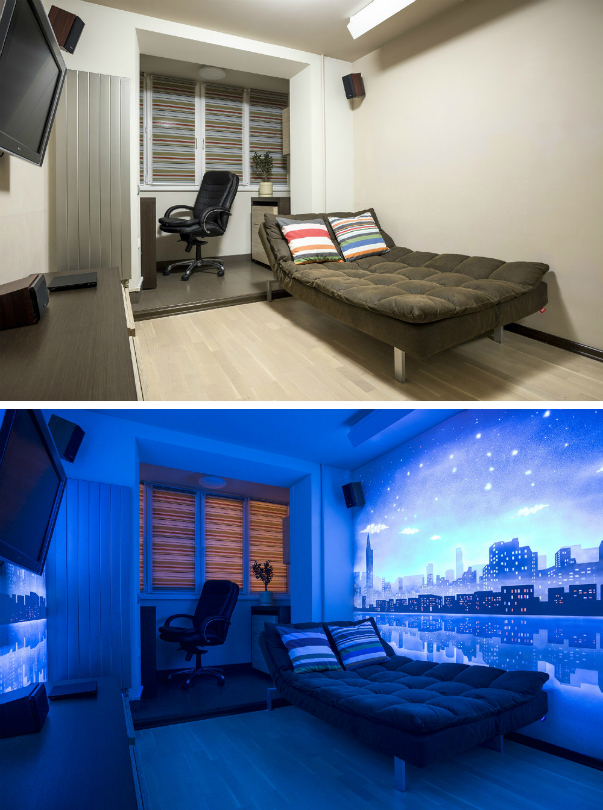 Пожалуй, самый фантастический вариант из нашей подборки. Роспись наносится на стену невидимой флуоресцентной краской, которая проявляется только при включении ультрафиолетового света (UV-светильников). Иногда такой рисунок наносится на уже имеющийся акриловый, добавляя ему сказочности, а порой дизайнеры выбирают простую однотонную стену, которая при естественном освещении даже не намекает о секрете, который скрывает. Это очень удобно, так как рисунок не надоедает.
