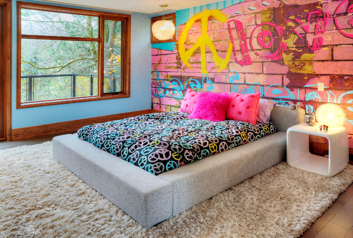 Уличное искусство граффити хоть и редко, но все же попадает в интерьеры. Чаще всего такую роспись стен выбирают люди молодые, творческие и питающие любовь к данному виду рисунков.