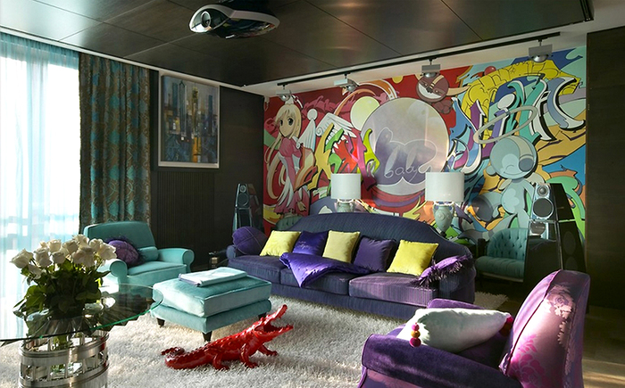 Уличное искусство граффити хоть и редко, но все же попадает в интерьеры. Чаще всего такую роспись стен выбирают люди молодые, творческие и питающие любовь к данному виду рисунков.