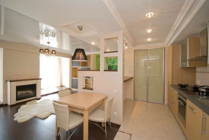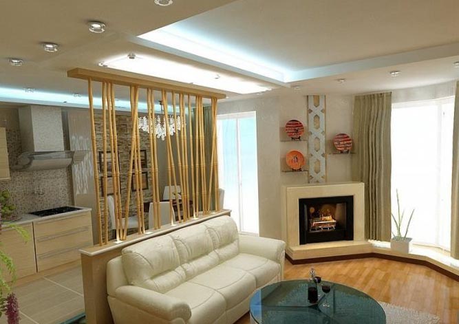 - Интерьер должен быть «воздушным» — нам обязательно пригодятся зеркальные поверхности, перегородки из тонкой полупрозрачной ткани или же из матового закаленного стекла. Малогабаритку нужно зонировать грамотно!!! Если нет необходимости в перегородках, мы можем разграничить комнату при отделке. Только комбинировать отделочные материалы тоже надо правильно. Пол тоже можно застелить разными материалами – например, на кухне и в прихожей плитка, а гостевая зона отделена ламинатом. При этом неплохо было бы еще и постелить небольшой коврик в «спальном пятачке». Это один из возможных вариантов зонирования в малогабаритке. Нам еще нужно подчеркнуть разные зоны в квартире светом, тогда общая картинка в доме станет точной.