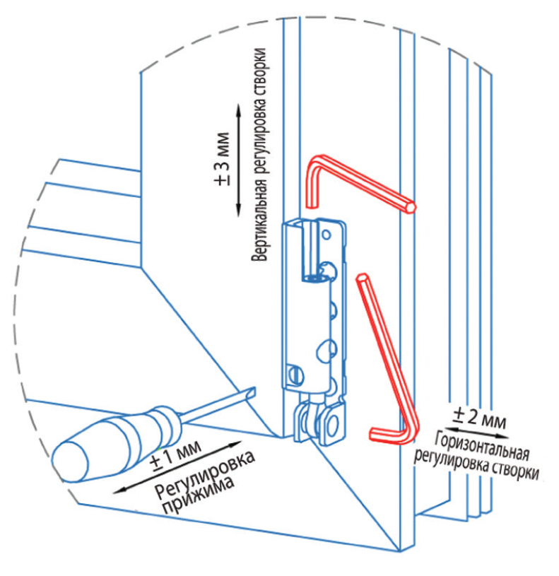 Механизмы регулировки находятся на петлях дверной створки. В торцевой части двери расположены регулировочные эксцентрики.
