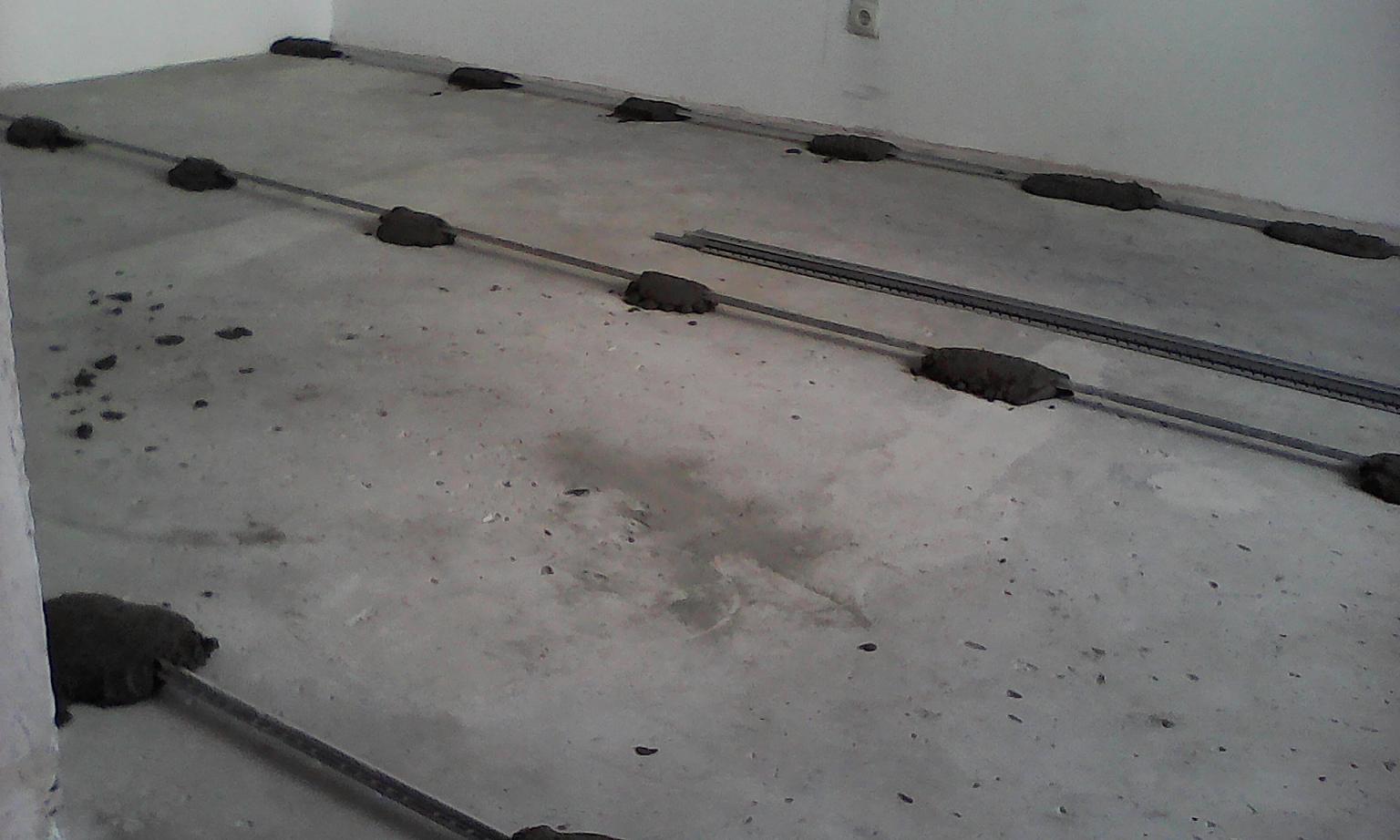 Способ крепления разный: можно соорудить горку из цемента или просто вкрутить маяки в пол. Важным требованием является параллельность направляющих. Расстояние между соседними должно позволять поставить на концы рейку, по которой будет выравниваться композиция.