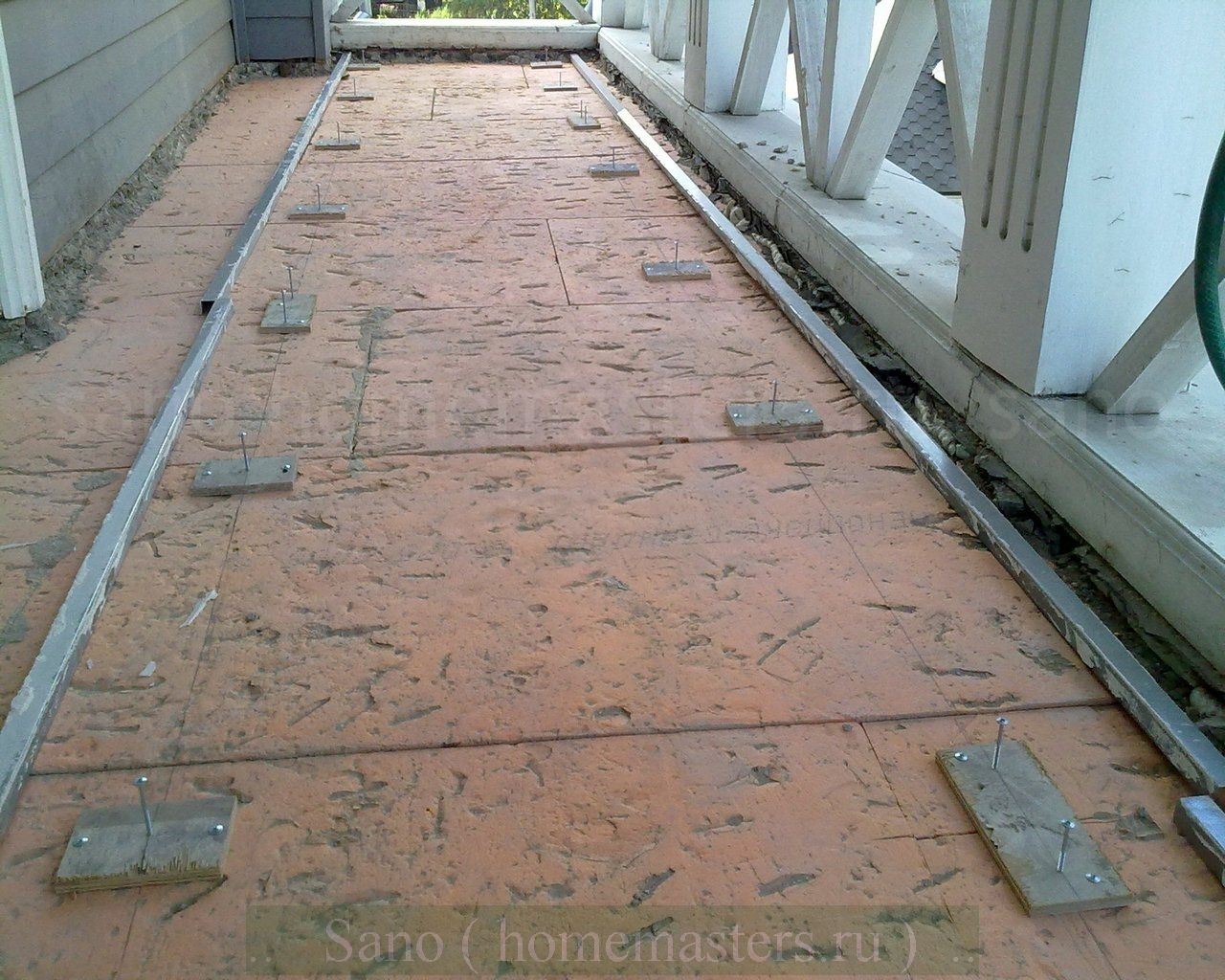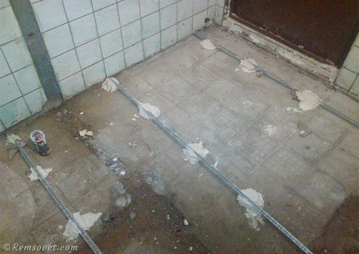Профили поднимаются на нулевой уровень с помощью холмиков цемента, внутри которых находятся куски кирпичей или деревянные бруски.