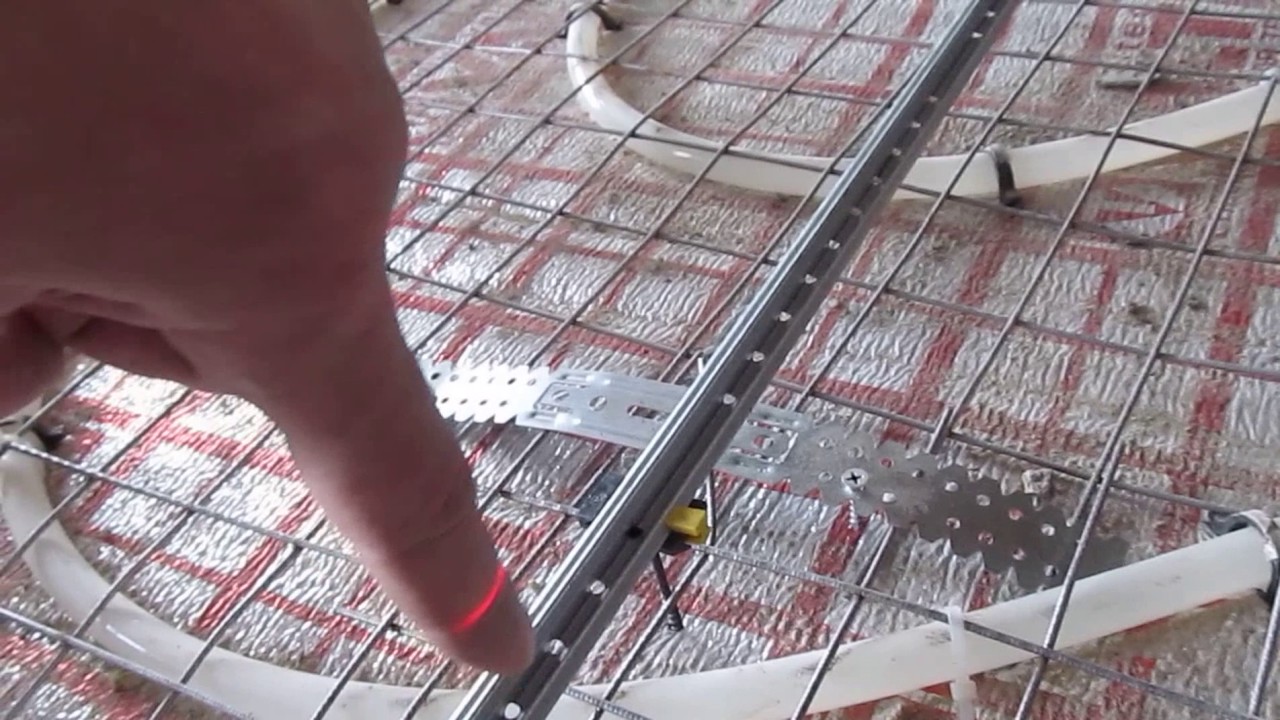 Чтобы было удобно устанавливать направляющие, между стенами натягивается нить, шнур или проволока.П-образные профили размещаются основанием вверх поверх саморезов. По натянутой нити закручиваются оставшиеся саморезы, чтобы направляющие выставить в нулевой уровень будущего пола. Правилом проверяется правильность горизонтали, а также правильное размещение профилей между собой.Аналогично может осуществляться установка маяков: