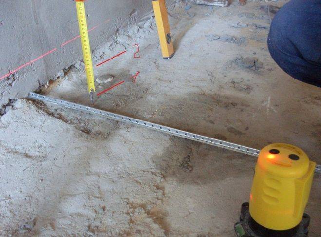 Вдоль линии будущего размещения направляющих в пол закручиваются саморезы, вкручиванием и выкручиванием которых выставляется высота профилей.Для контроля горизонтали между вкрученными саморезами натягивается нить, шнур или леска.