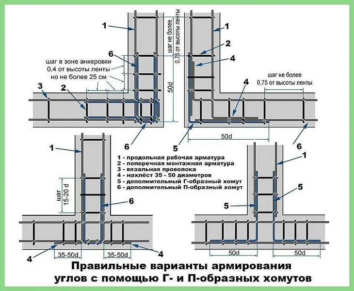 Пример увязки перпендикулярных прутьев арматурыТочный расчет армирующего пояса проводят проектировщики фундамента с учетом многочисленных критериев – типа и общей массы здания, стабильности грунтов, сейсмических особенностей региона, других величин.