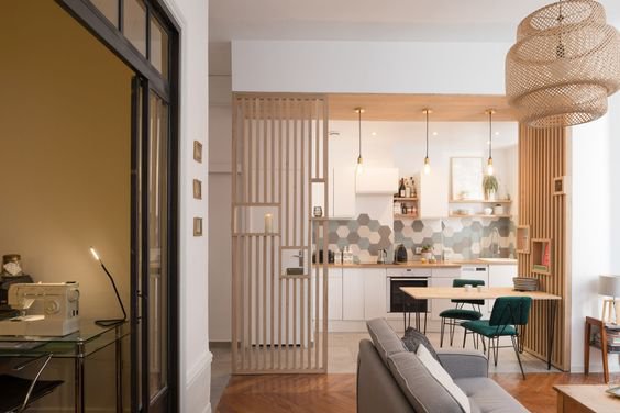 - Раздвижные модули. Кухня с раздвижными дверями, которые выполняют функцию разделителя, являются частым примером совмещенной комнаты. Модули могут быть разными: в виде японских ширм, перегородок из стекла (матового или прозрачного), дерева, тканей, пластика.