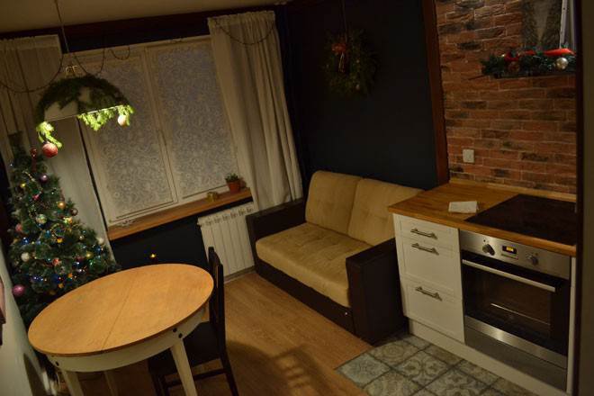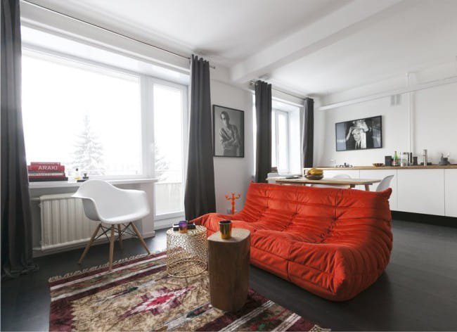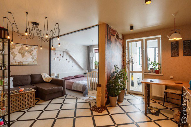 - Вариант студии, где на одной территории соседствуют кухня, гостиная и спальня. Для молодой семьи без детей или для одиночек – достойный вариант.