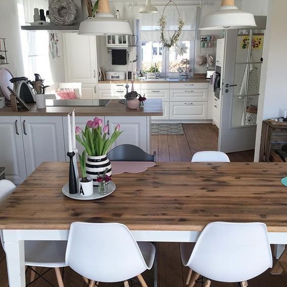 Этот способ считается наиболее простым и распространенным. Самый простой вариант – воспользоваться обеденным столом. Если установить его на границе отдельных зон, то без проблем удастся отделить зону готовки от зоны приема пищи. Для того чтобы усилить эффект, можно окружить большой стол по-разному окрашенными стульями, но выполненными в одном стиле. Часть из них по цветовой гамме будет соответствовать обеденной зоне, а часть – рабочей.