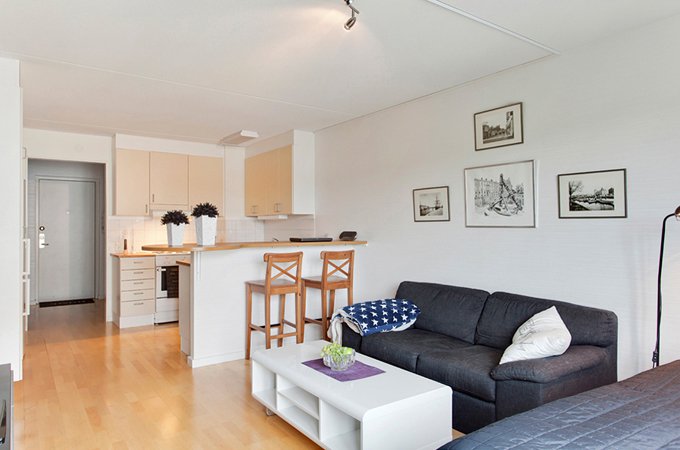 Как правило, так обустраивают однокомнатные квартиры с большой кухней. Единственную комнату отдают под спальню, а гостиную переносят на пространство кухни.
