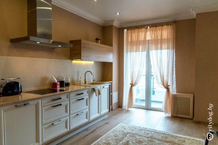 - Шторка стала разделителем, неброским и несложным в устройстве. Интересно, что делит она скорее кухню и спальню, нежели кухню и гостиную.
