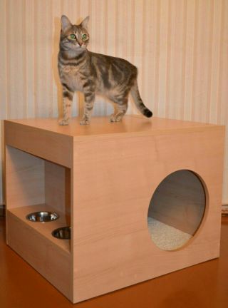 Если домик для кота лучше построить многоуровневым — с разными по высоте этажами, потому что им нравится находиться в позиции сверху, то для кошечек вполне сгодится обычный «приземленный» домик.