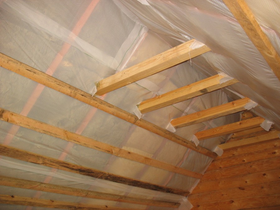 - Произведите укладку пароизоляционного материала. Это может быть изоспан, полиэтилен или рубероид. Закрепите пароизоляцию на рейках, а места крепления заделайте скотчем для герметичности покрытия.