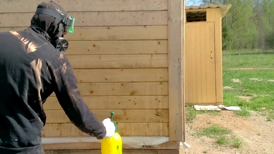 - Перед утеплением обязательно обработайте стены сруба специальным антисептическим раствором.