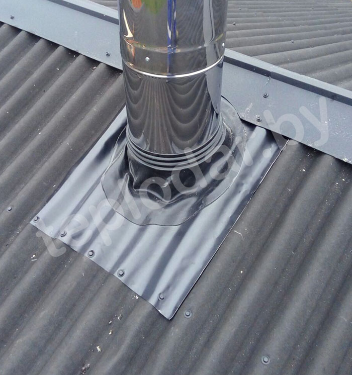 - Щель между кровлей и внешней стенкой трубы обкладывают уголками из нержавейки. Если дымоход овальной или круглой формой можно использовать резиновый уплотнитель на клейкой основе.