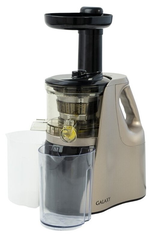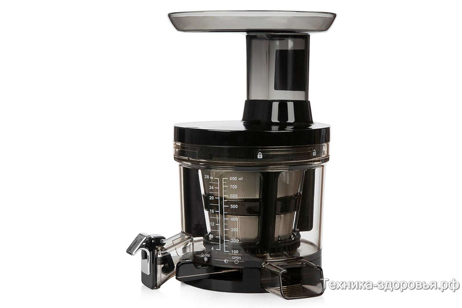 Внешний вид весьма элегантный и роскошный за счет своей формы, а также цветовой гаммы – металла и черного пластика. Участвует в самом отжиме вертящийся шнек, применяющий давление на части продуктов и, впоследствии отправляющий их на фильтр, откуда и выделяется готовый сок.