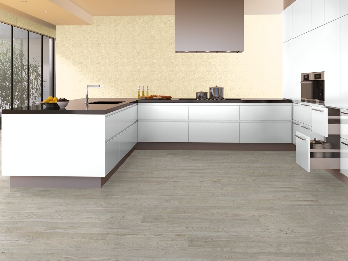 Этот материал отличается прочностью, не деформируется и не выцветает. Гигиенические свойства материала и легкость уборки делают его незаменимым напольным покрытием для кухни.