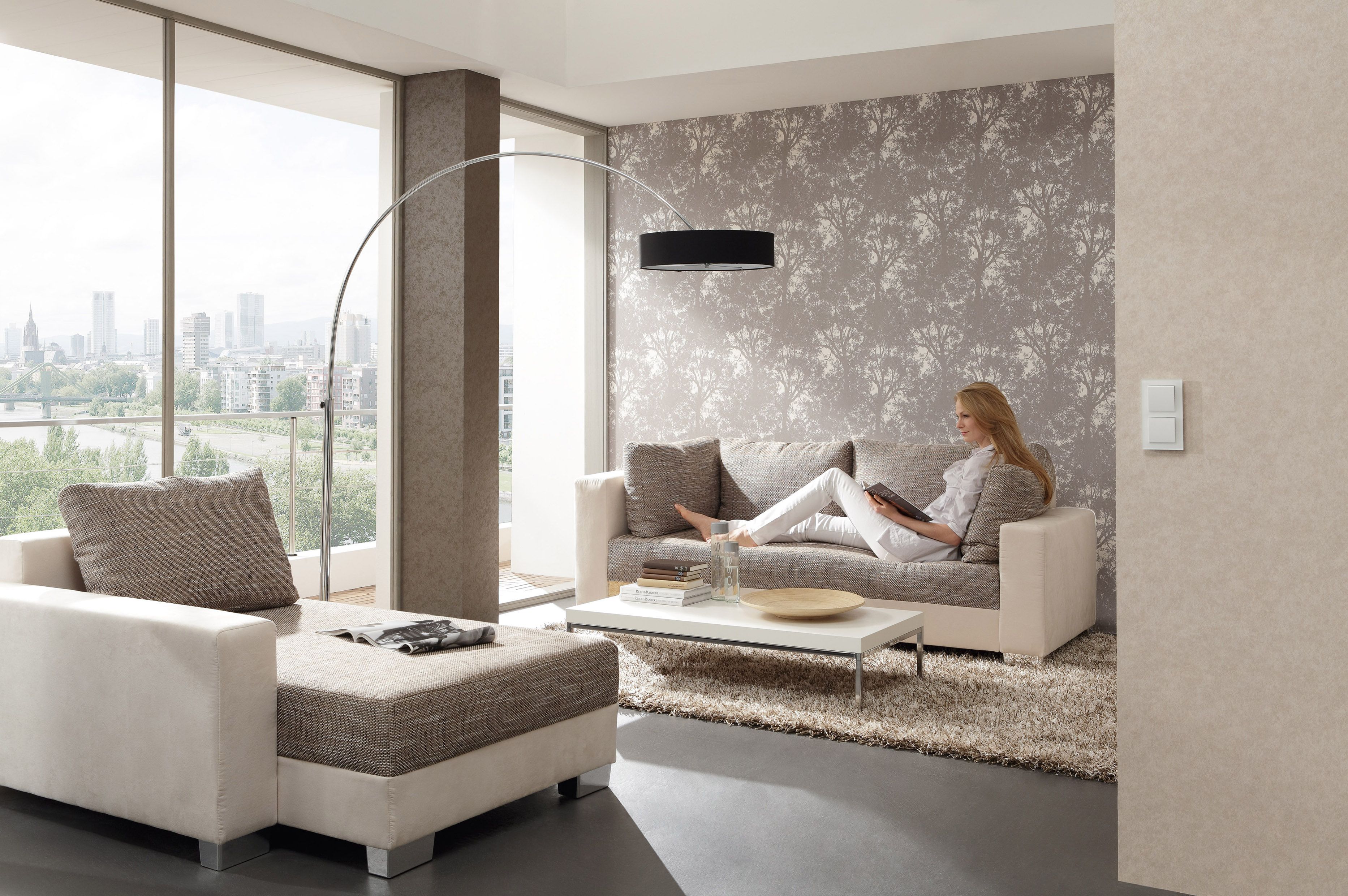К выбору рисунка на центральной стене необходимо подходить избирательно. Панорамные фотографии природы или городские пейзажи дают скучному интерьеру динамики, являются продолжением гостиной. Пространство как-будто находится в движении.