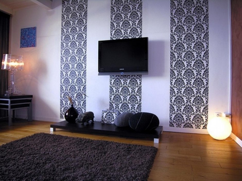 Новый взгляд на классический способ приклеивания полотна. Не требует особых человеческих ресурсов, и не занимает много времени. Важно подобрать гармоничное сочетание цветов. Как правило, их не больше 2-3.