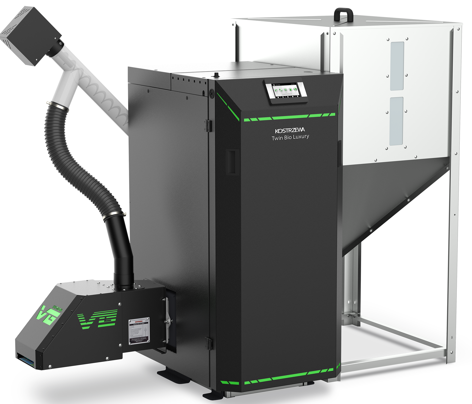 Бункер обладает двухшнековой системой подачи, надежно предохраняющей его от воспламенения. Система удаления золы функционирует в автоматическом режиме, что облегчает обслуживание горелки.