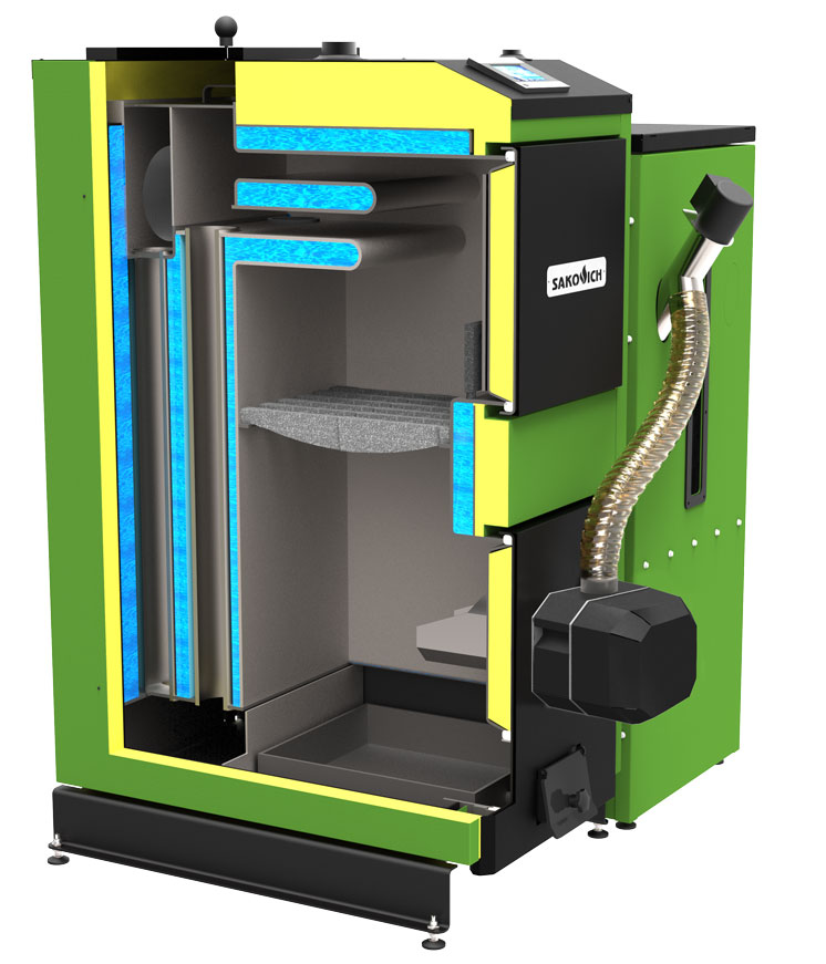 Вертикальный теплообменник способствует высокой эффективности и безотходности сжигания. Автоматическое удаление золы обеспечивает удобство обслуживания.
