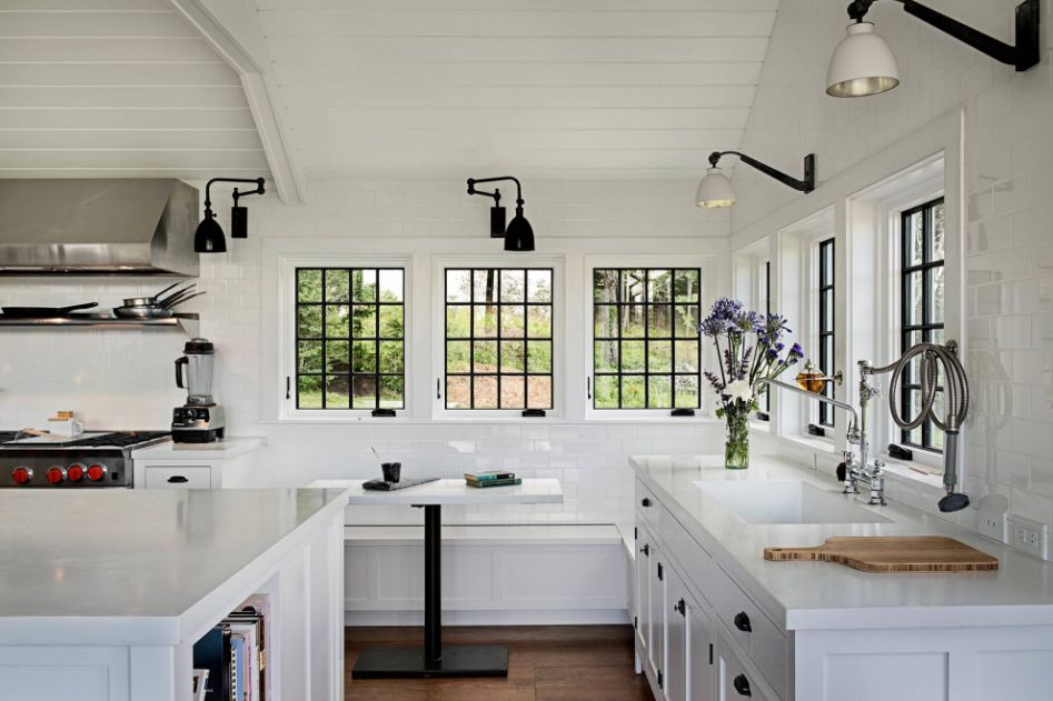 Небольшие окна с черной рамкой тоже могут выглядеть очень интересно. Посмотрите на эту кухню, собранную Crisp Architects. Его декор основан на черном и белом — вневременном и классическом сочетании. Нам нравится, как черный цвет использовался для выделения и обрамления некоторых элементов дизайна, таких как осветительные приборы, фурнитура шкафа, а также виды.