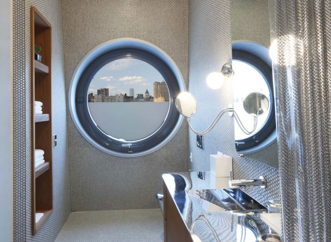 Посмотреть в галерее Круглое окно в ванной комнате добавляет морскую нотку дизайну, особенно с учетом вида.