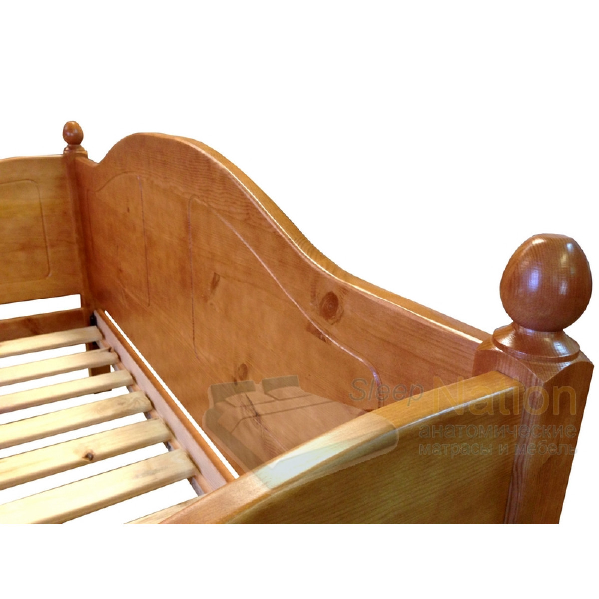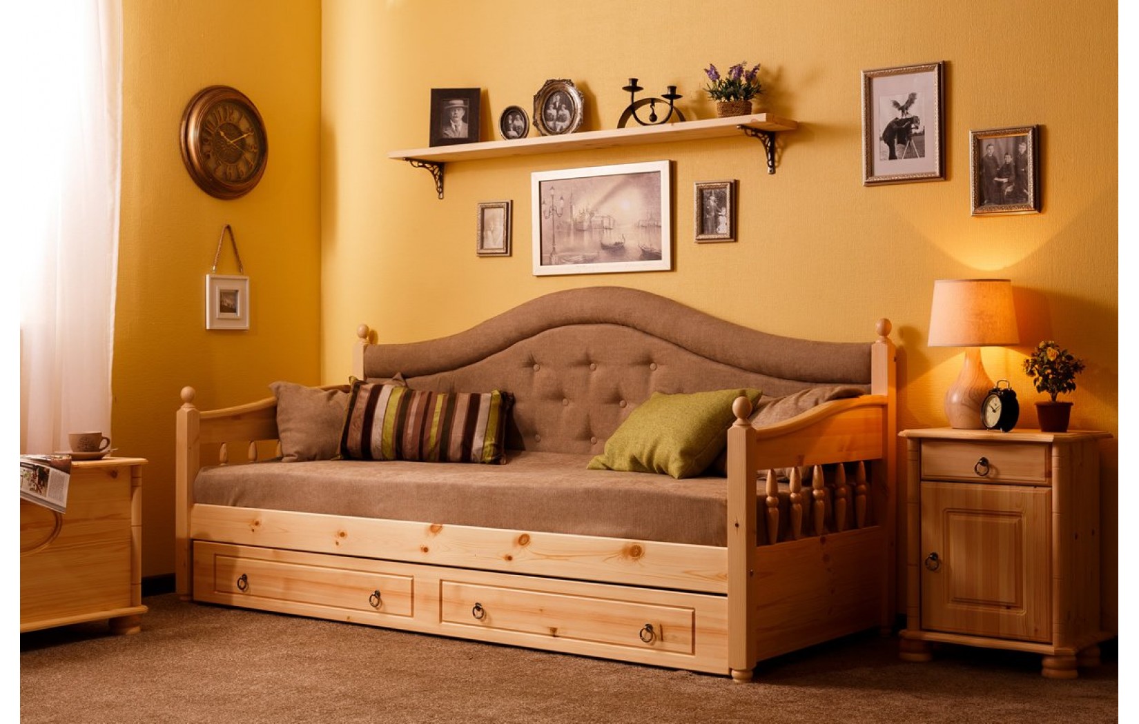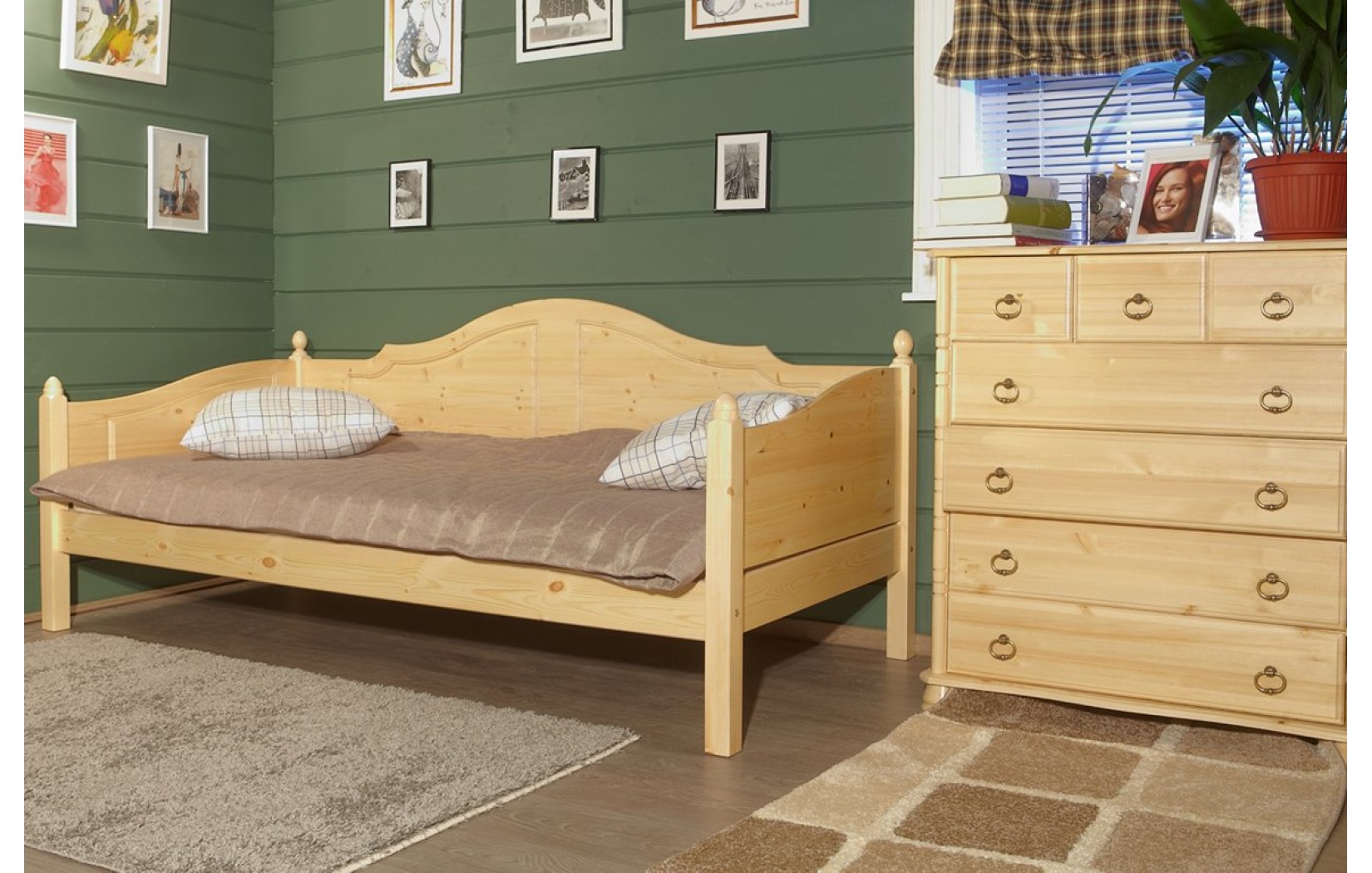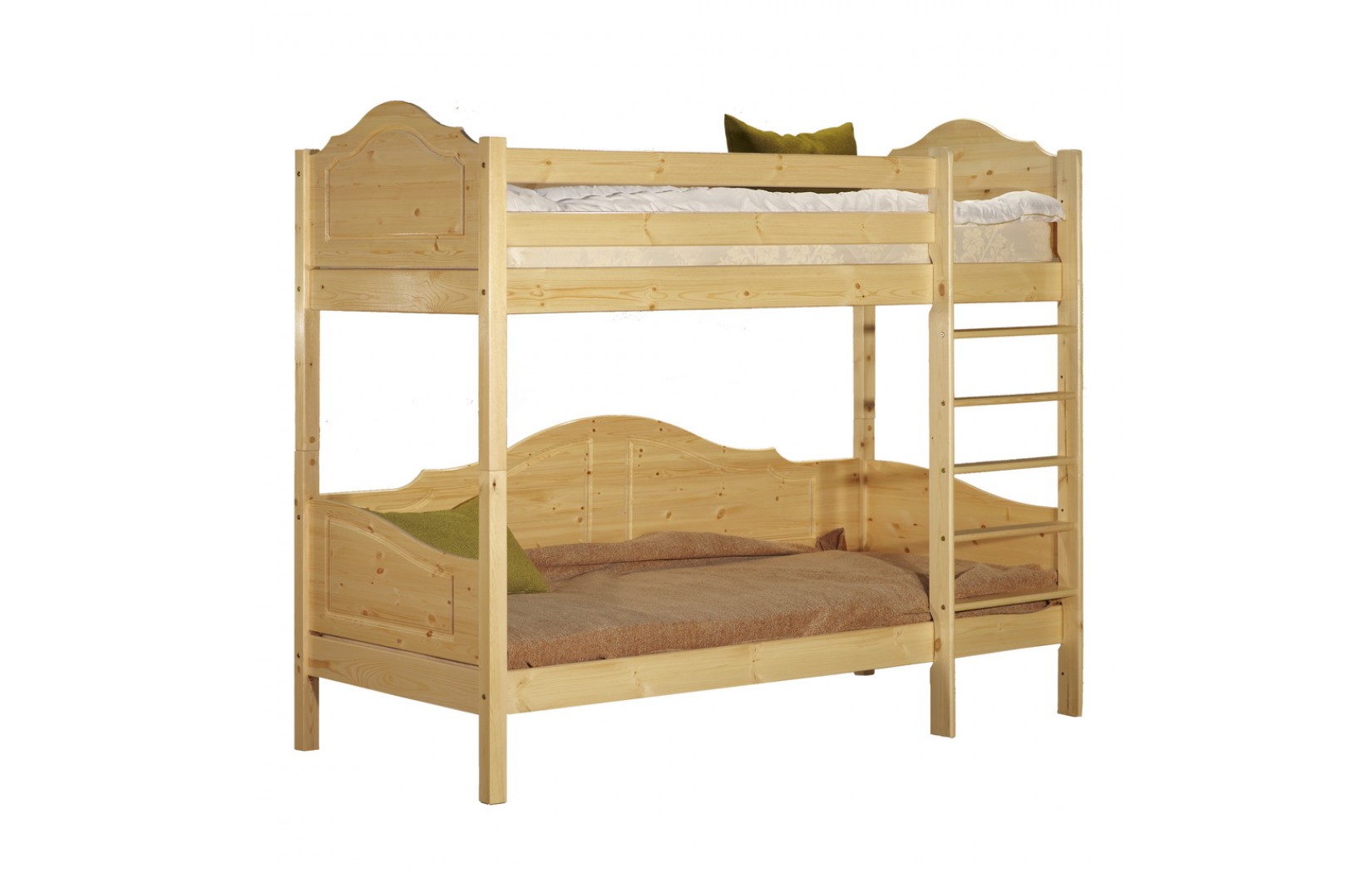 Считается, что сосна обладает целебными свойствами. Такое сырьё отличается высоким содержанием смол. На поверхности сосны обычно присутствует большое число сучков, а структура является неоднородной. Несмотря на такие качества, эта порода является ударопрочной и долговечной, а сосновая мебель может беспроблемно прослужить более 15 лет. Зачастую такие кровати передают от старших детей младшим либо вовсе передают из поколения в поколение. Стоят подобные изделия недорого, а выглядят потрясающе.