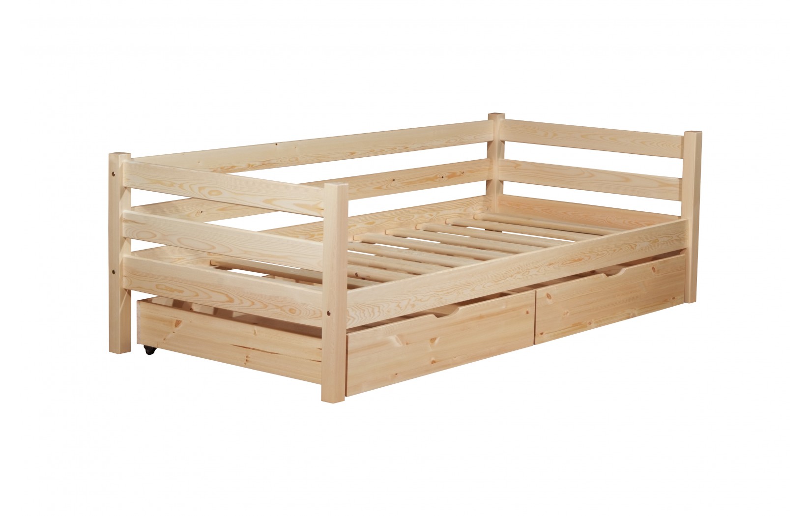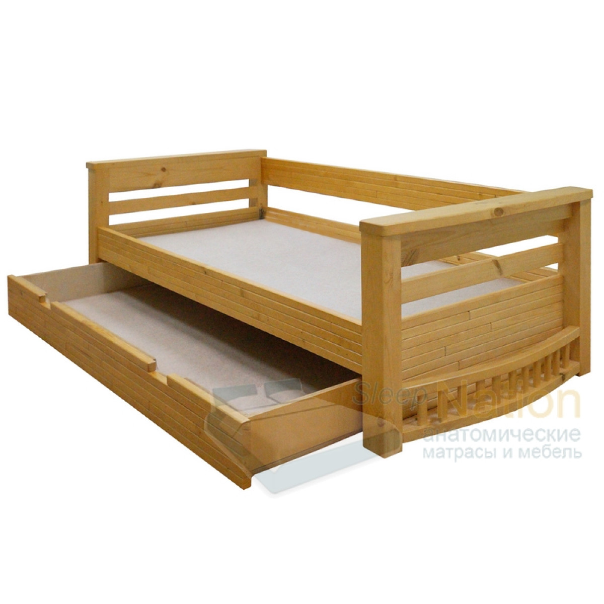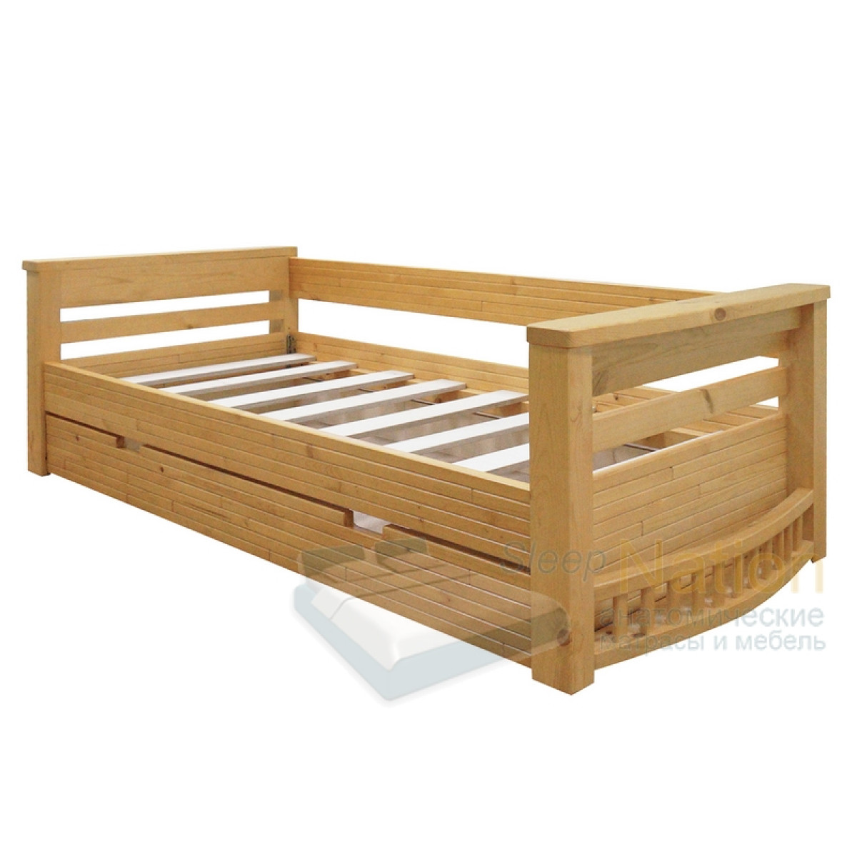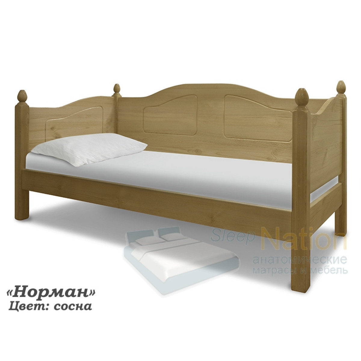 Считается, что сосна обладает целебными свойствами. Такое сырьё отличается высоким содержанием смол. На поверхности сосны обычно присутствует большое число сучков, а структура является неоднородной. Несмотря на такие качества, эта порода является ударопрочной и долговечной, а сосновая мебель может беспроблемно прослужить более 15 лет. Зачастую такие кровати передают от старших детей младшим либо вовсе передают из поколения в поколение. Стоят подобные изделия недорого, а выглядят потрясающе.