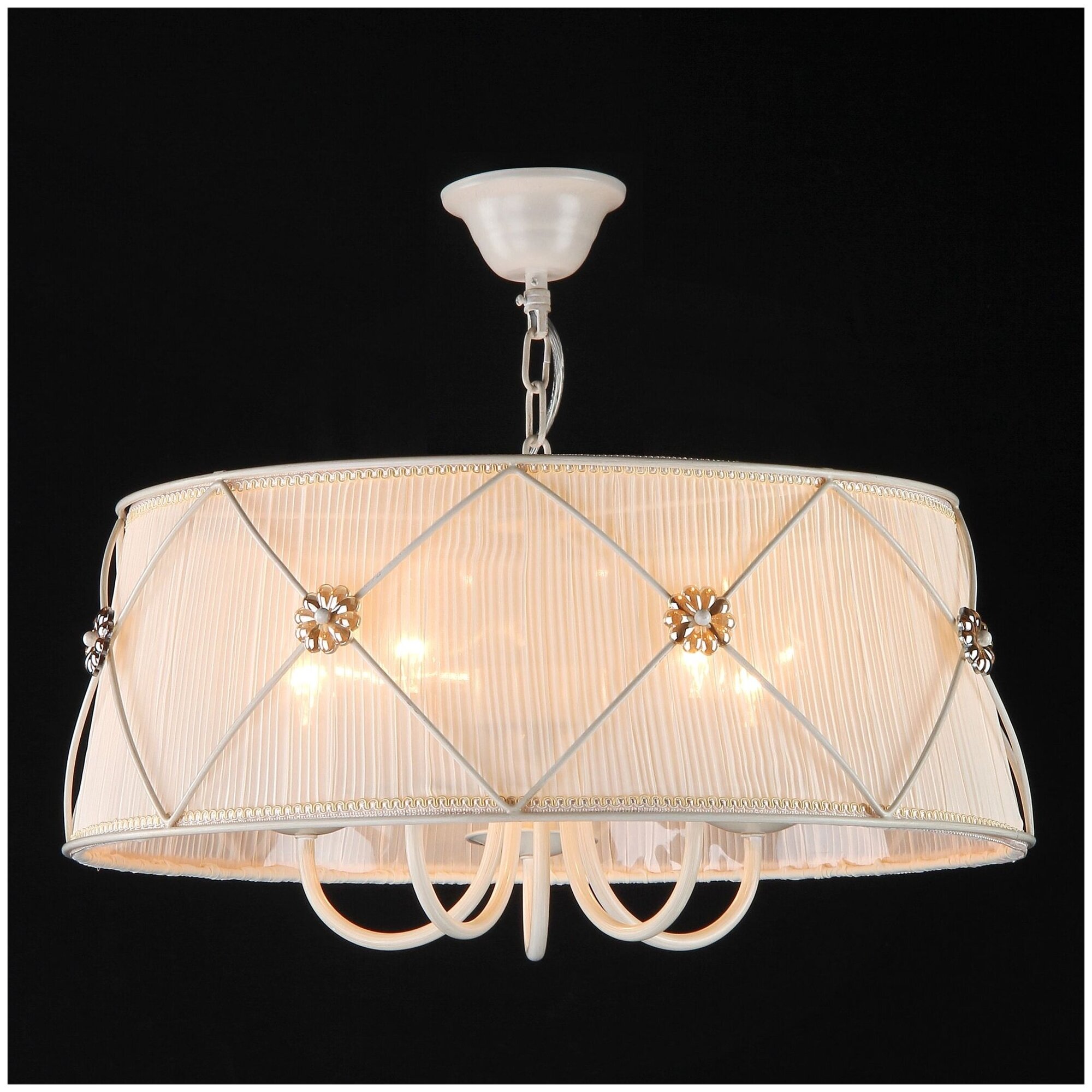 Классическая люстра в прованском стиле – кованый металлический каркас, тканевые плафоны с кружевом и рюшами, лампы-свечи, декор с флористическими мотивами.