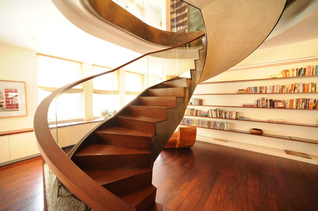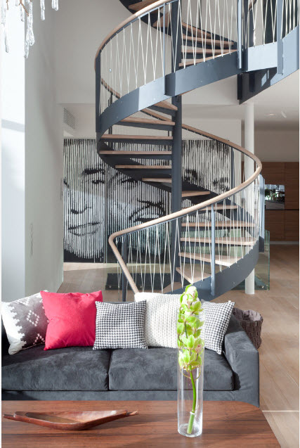 Винтовая и криволинейная лестница – лучший способ экономить место. Занимают маленькую площадь, удобные в использовании. Но, как говорили раньше, если у вас в доме будут дети и пожилые люди – присмотритесь к другим вариантам.