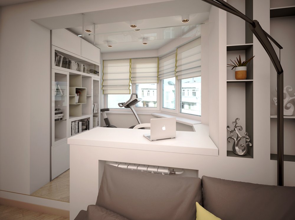Рабочая комната на балконе вполне подойдет для комфортного труда одного человека. Важную роль здесь играет достаточное количество естественного света, что немаловажно при сидячей работе. При этом бывшее окно переделано в элегантный стеллаж для книг.