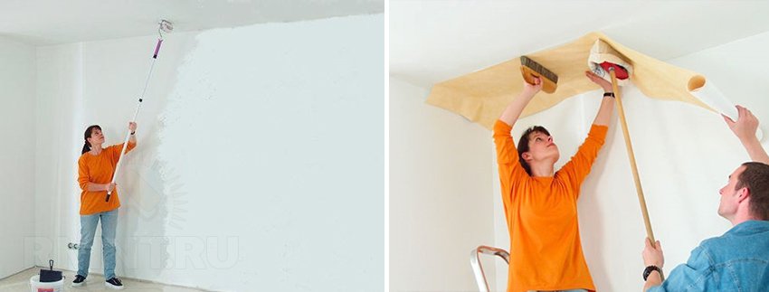 Соответственно — для натяжного потолка нужны уже выровненные стены. Но возникает логичный вопрос: если стены ровные, а покрытие уже натянуто — можно ли клеить обои? Для ответа переходим ко второму этапу работ — грунтовке.
