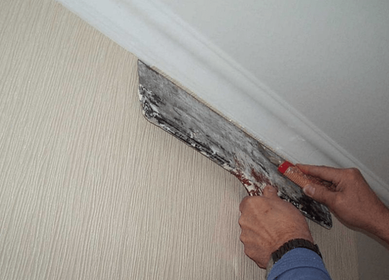 Затем нужно снять специальную вставку на стыке обоев и потолка и удалить старые обои.