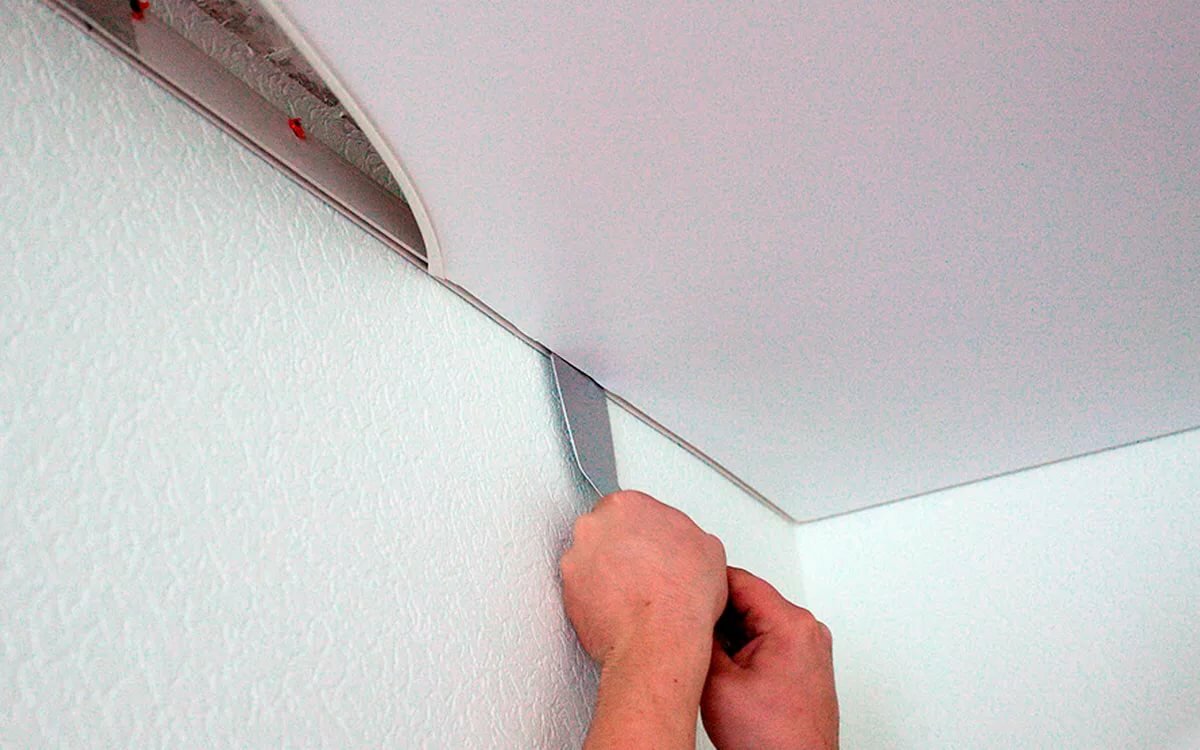 Если предыдущие листы были приклеены после установки натяжной конструкции, после удаления декоративной вставки можно приступать к удалению старого покрытия.Если потолочные багеты закреплены поверх обоев, то их придется подрезать.