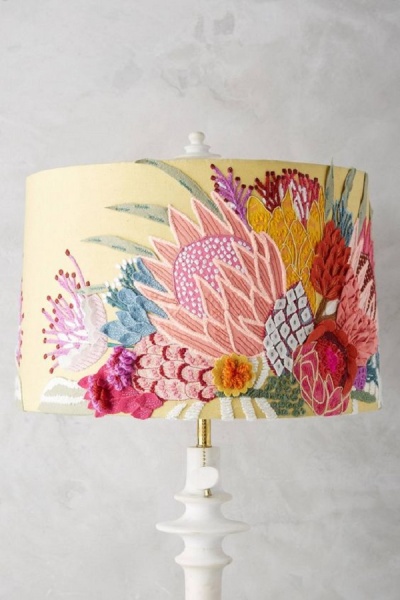 Для женской спальни подойдёт лампа с абажуром в виде художественно оформленной ткани. Лёгкие волны на полотне напоминают о морском бризе и облаках. Хорошо грациозный торшер смотрится в помещениях в стиле модерн. Это изысканное украшение даёт мягкий, рассеянный свет.