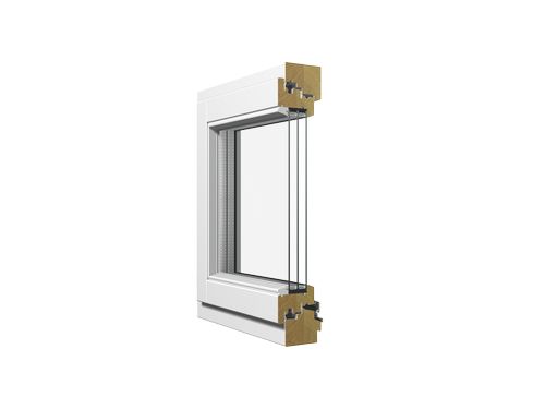 Дерево-алюминиевое окно. Стеклопакет имеет остекление 2+2 (Остекление: стеклопакет 4/18/4 мм (аргон + селектив) в наружной раме + стеклопакет 4/18/4 мм (аргон + селектив) во внутренней раме. Наружное стекло Frost Free). Толщина коробки 131, 175 или 210 мм. Коэффициент теплоизоляции до 0,59 Вт/(м2К) Уровень звукоизоляции Rw 51.