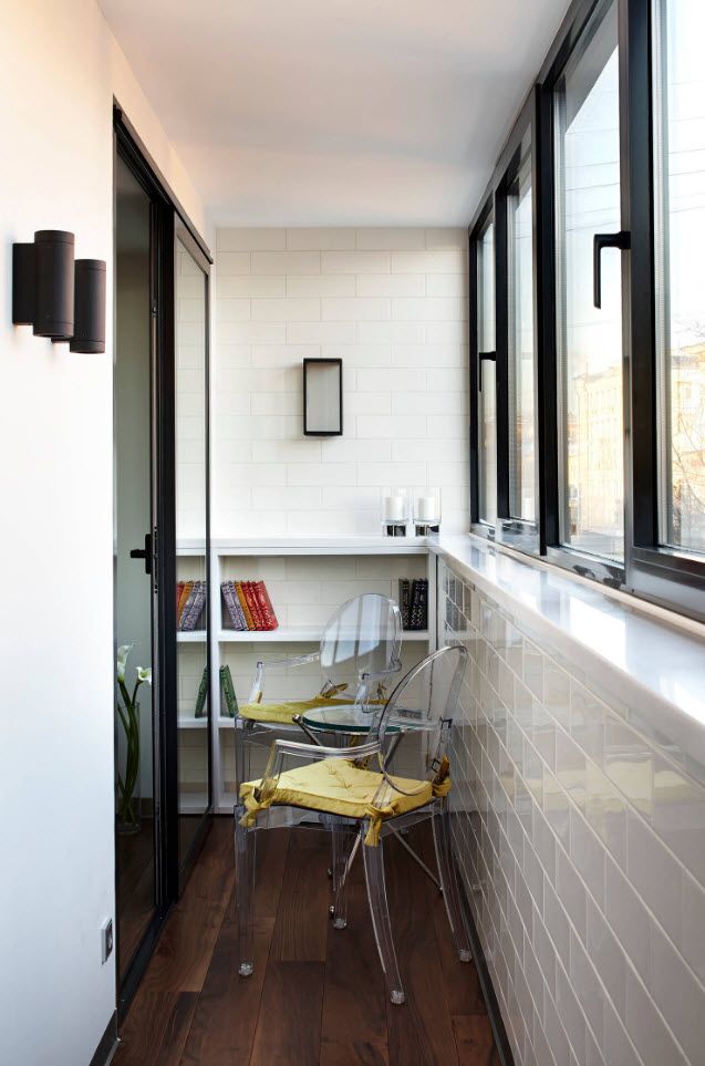 Если вы хотите современный балкон, выбирайте простоту. Цветовые схемы обычно черно-белые, с одним или двумя акцентами яркого цвета. Мебель определена незамысловатыми формами и стремится к минимуму. Характеристикой современного дизайна и минимализма является открытое пространство.