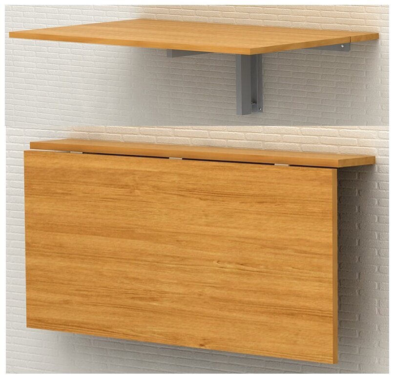 Рабочая поверхность откидных версий монтируется к стене с помощью шарнирного крепления с одной и более петлями. Это предоставляет возможность без труда сложить или разложить конструкцию.