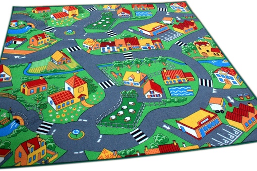 Изображения на таких коврах больше напоминают именно такие детские рисунки с видами сверху. Если ваш детский рисунок умещался на листке, то ковер – это уже огромный масштаб, и тут есть, где разгуляться детской фантазии! Ребенок может придумывать любые игровые сюжеты: то он водитель машины, мчащейся по запутанной сети вытканных автодорог, то пешеход, переходящий через дорогу, то житель небольшого городка. Такое покрытие можно считать полноценным развивающим пособием для детей.Промышленность выпускает такие ковры с разным цветовым решением и дизайном. Для большей реалистичности в некоторых моделях в покрытии сочетается различная длина ворса: для дорог – небольшой и гладкий ворс, для деревьев, клумб, домов – более длинный, мягкий и пушистый. Это помогает не только реалистично передать рельеф местности, но еще и развивать тактильные ощущения. Покрытия с разными текстурами могут являться одновременно и массажными ковриками.