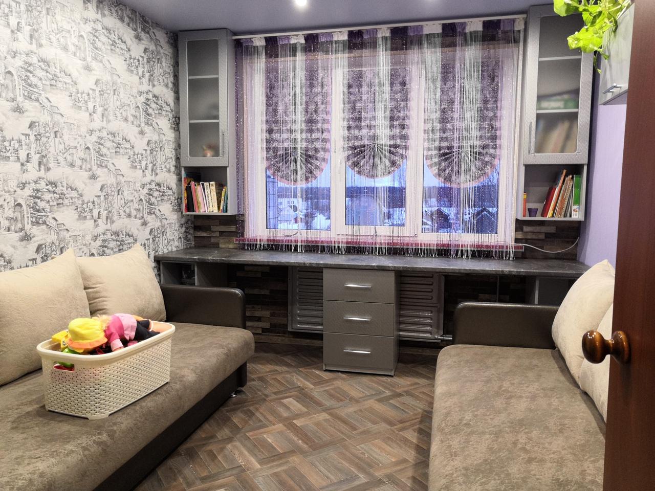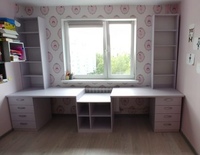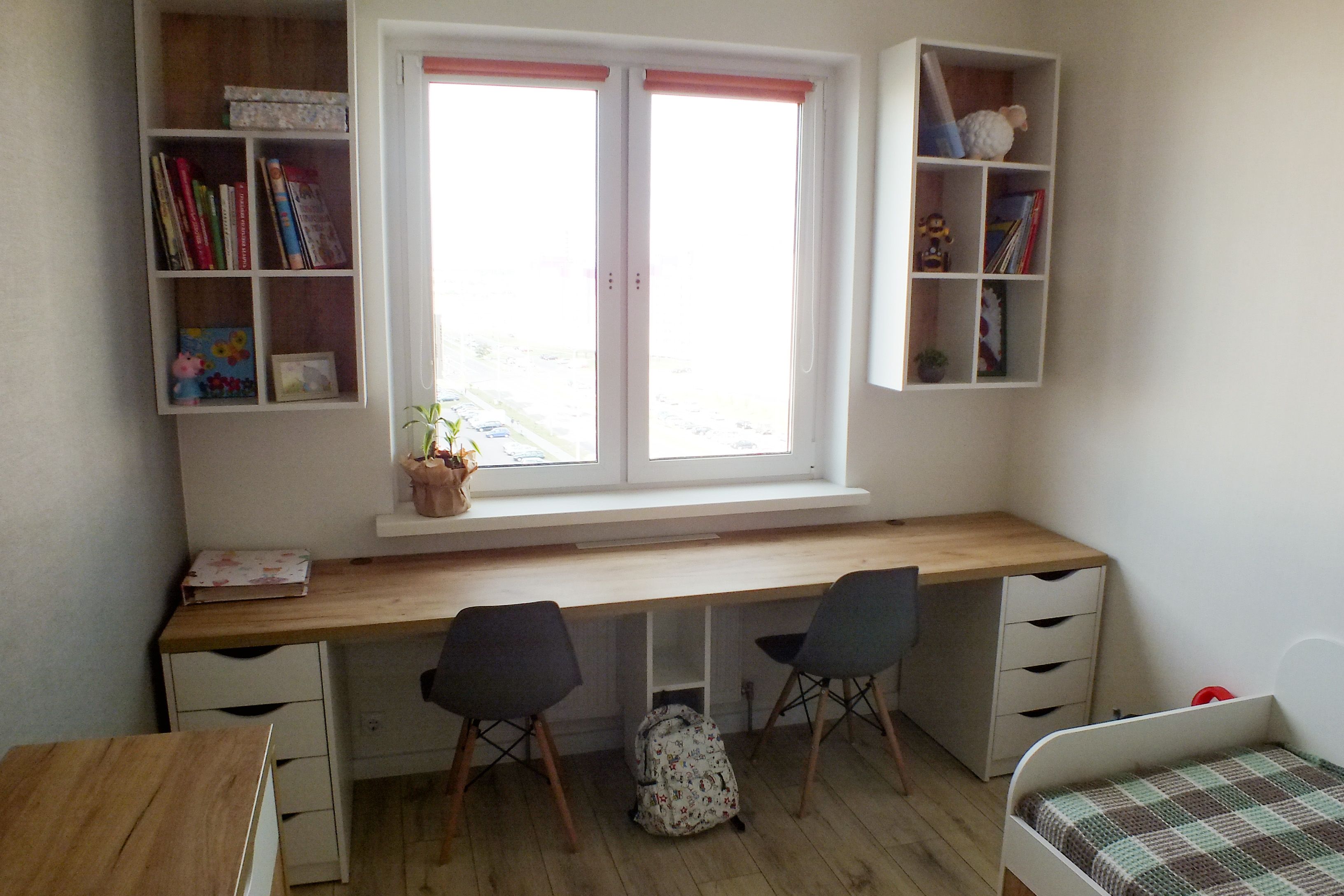 письменная и рабочая столешница с полочками вдоль окна в комнате для двух детей
