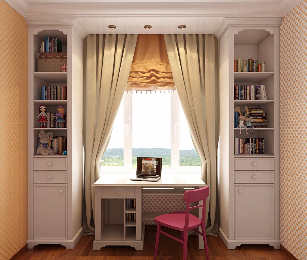 Стол у окна в детской можно оборудовать полками для книг и выдвижными ящиками для канцелярских принадлежностей.