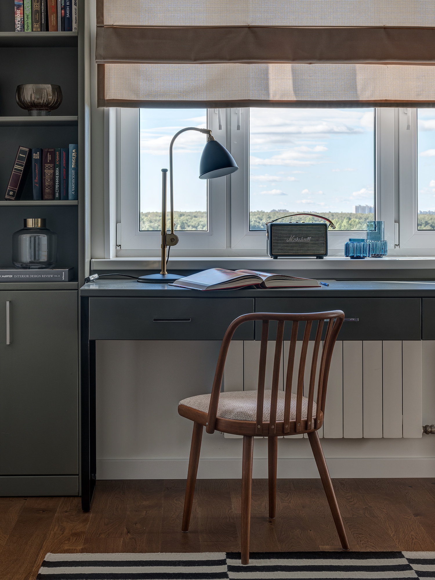 Дизайн гнездаГолубовато-серое рабочее кресло стоит у встроенного стола в спальне под окном и освещается медным бра.