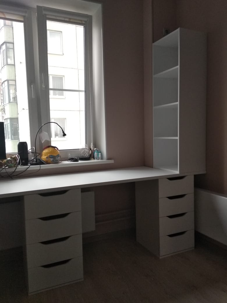 Два одинаковых стола. Данная модификация хороша тем, что между партами остается проход, который естественным образом разделяет пространство. Также открывается свободный доступ к окну без необходимости становиться на мебель. Очень важный момент в том, что столы одинаковые и у каждого ребенка равное количество ящиков и полок для своих личных вещей. Отдельное внимание стоит уделить освещению, так как свет будет падать с разных сторон.