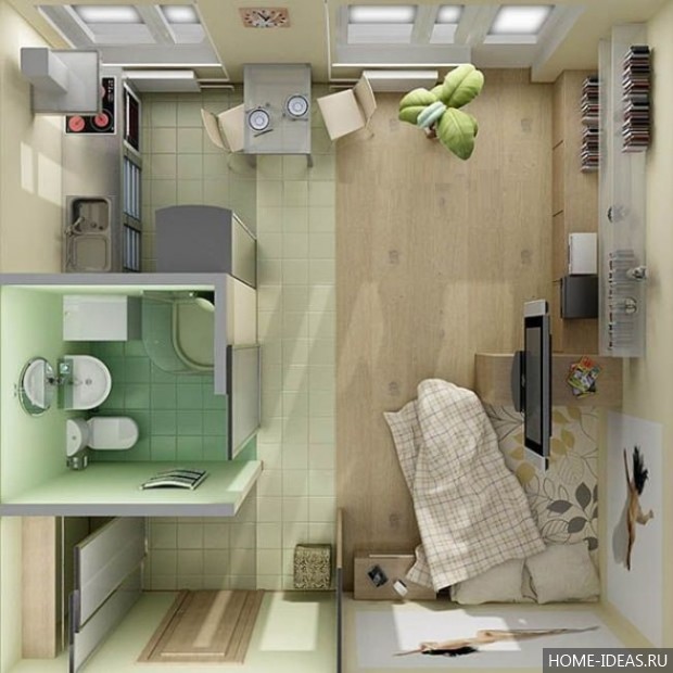 Однако правильная планировка маленькой студии позволяет вместить все необходимые для комфортной жизни зоны.