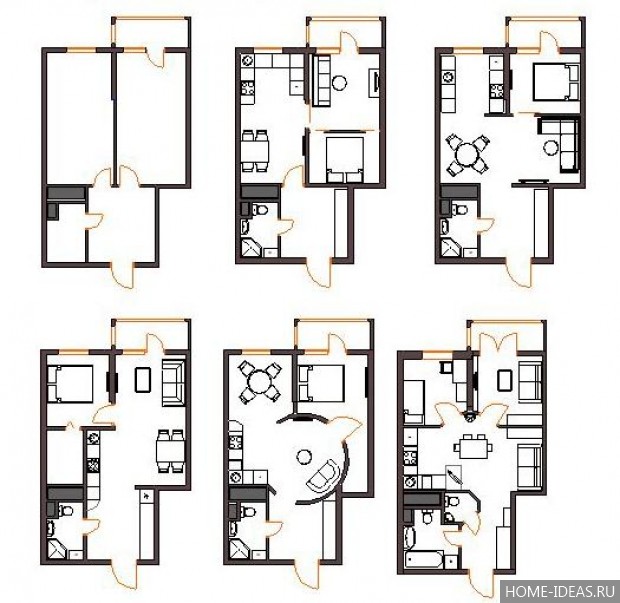 Межкомнатные стены придется демонтировать, возле кухонной части организовать будуар, в котором выделить место для компьютерного стола. Рабочая поверхность кухонного гарнитура включит подоконник. Мойка перенесется на противоположную окну стену. Коридор выделится двумя диагональными перегородками, под одну из которых можно будет поставить шкаф-купе. Оставшееся пространство в планировке малогабаритной квартиры отдается под гостевую зону. Между кухней и гостиной помещается обеденная группа.
